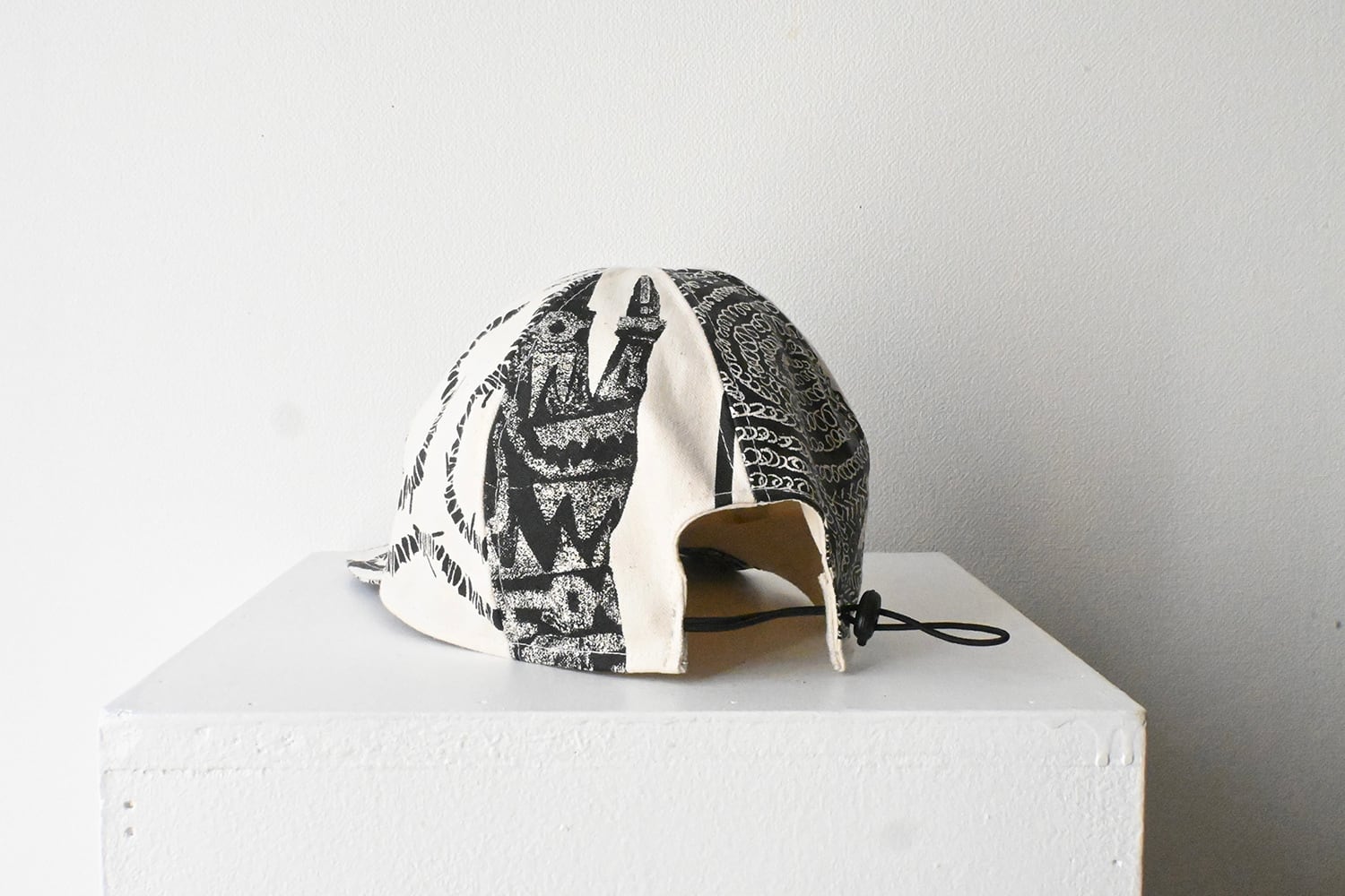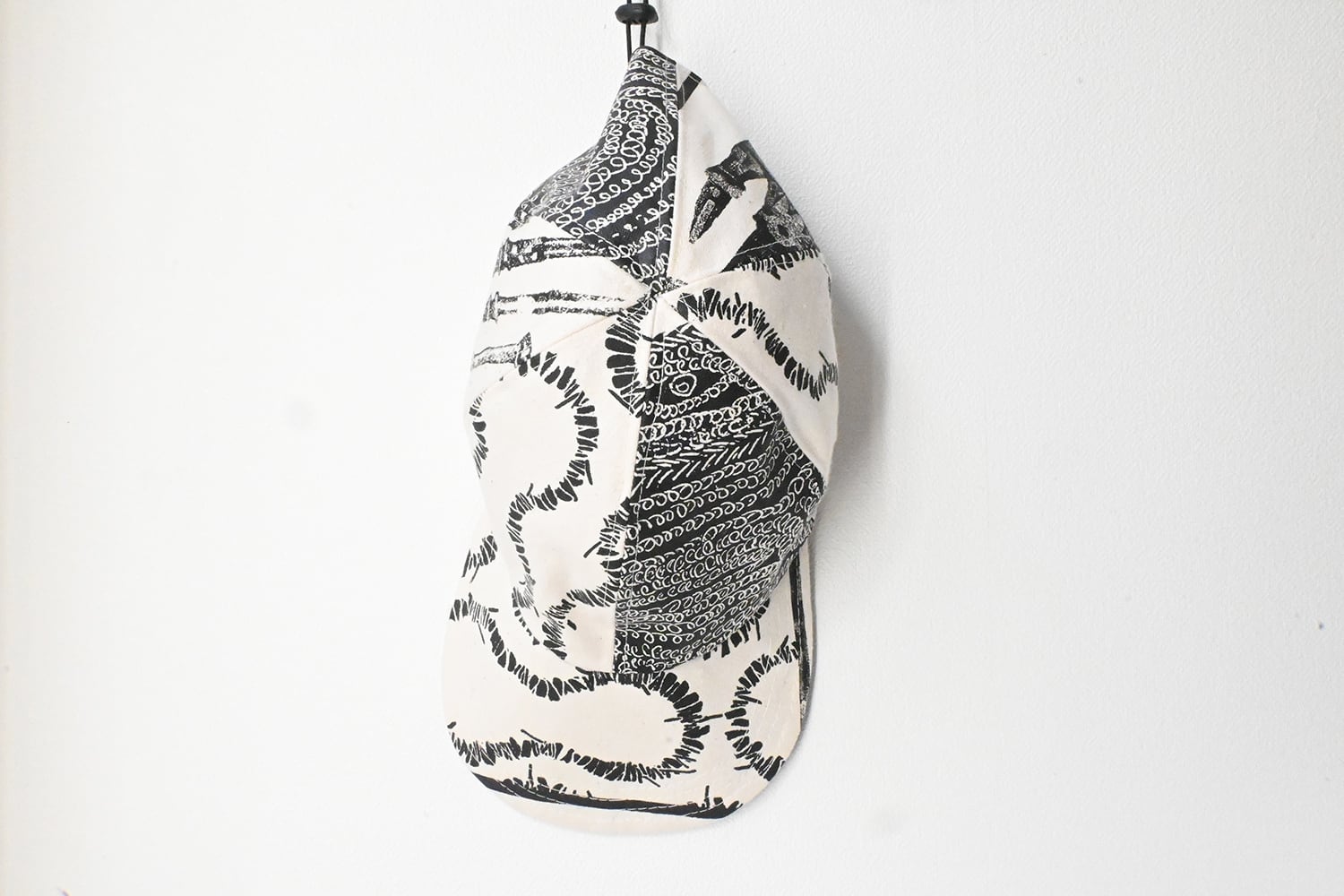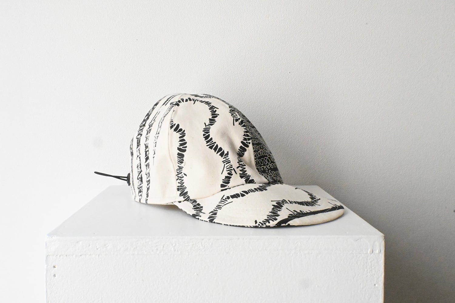 金子自らがシルクプリントした生地をランダムに裁断し、縫製された一点物の帽子です。