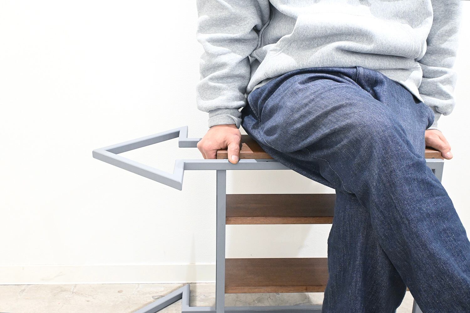 矢印デザインのコンパクト・ベンチ。靴の脱ぎ履きに丁度良い高さで、棚にはお気にりのシューズや、クリーニングキットなどを収納できます。矢印の部分に靴ベラ掛けてもいいかも。