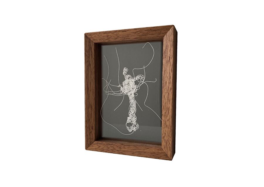 現代美術家 黒沼真由美さんの小作品「レース編みのゾエア」シリーズよりイセエビの幼生期を絹糸で再現した作品です。木工作家 佐々木毅さんの自立式額縁とコラボしたことで、海中に浮遊しているイメージを表現しています。二枚のアクリルで挟んでますので、表裏、両方から鑑賞できる透明感のある作品へと仕上がりました。