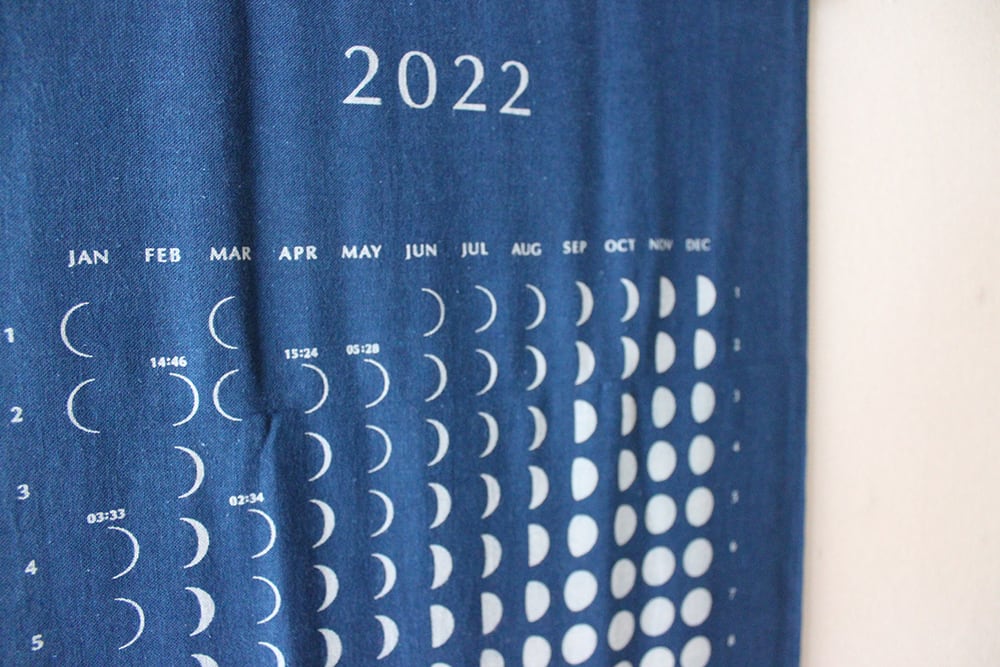 藍染工房 LITMUS のムーンカレンダー2022年度版です。 日本の伝統的な藍染め”灰汁醗酵建て(あくはっこうだて)“による手ぬぐいのムーンカレンダーは、一枚ずつ"抜染(ばっせん:染めた色を抜く染色技法)”を施し、日々の月の満ち欠けを表現します。満月と新月の日には、その時刻を記しています。 *掛け(ブラック・ウォルナット)は別途¥5500(税込)かかります。