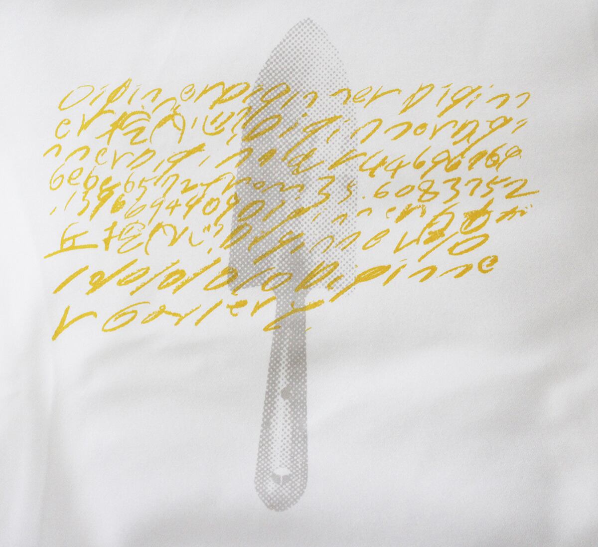 胸の刺繍ロゴはアーティスト大岡弘晃氏描き下ろしによるもの。バックプリントも同じく大岡弘晃氏にデザインしていただいた版を用い、ギャラリーのDIG(掘る)をイメージした象徴的なスコップのデザインと共に刷っております。